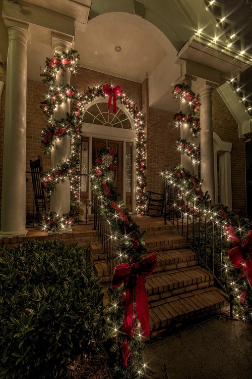 A stunning garland display makes a grand impression. It turns your Christmas entryways into a warm, inviting space.
